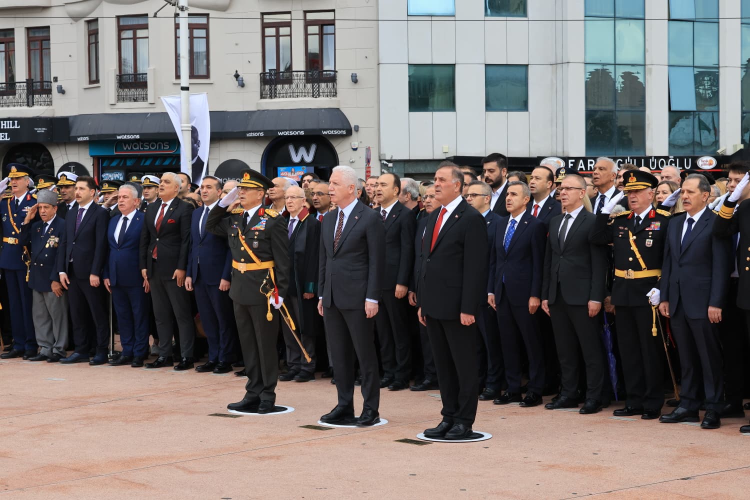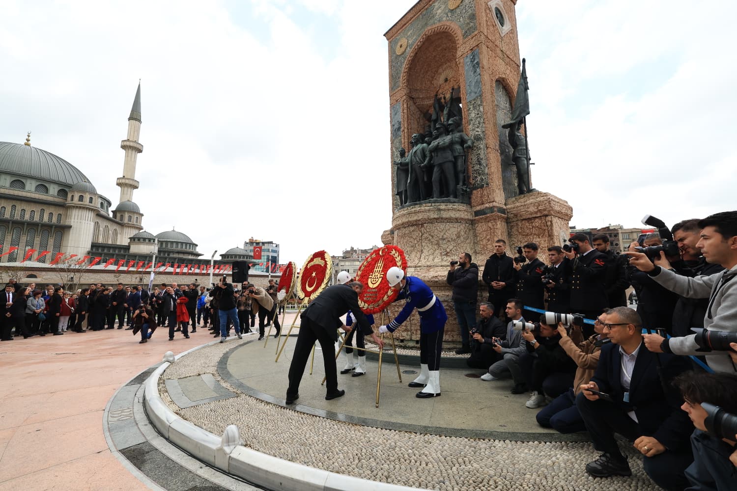 İstanbul Valisi Davut Gül, 1. Ordu ve İstanbul Garnizon Komutanı Orgeneral Bahtiyar Ersay ve İstanbul Büyükşehir Belediyesi Başkan Vekili Nuri Aslan, Taksim’deki Cumhuriyet Anıtı’nda bir araya geldi. Siyasi Parti ve Sivil Toplum Kuruluşlarının temsilcilerinin de olduğu törende sırasıyla Gül, Ersay ve Aslan tören mangası eşliğinde Atatürk Anıtı’na çelenk bıraktı.